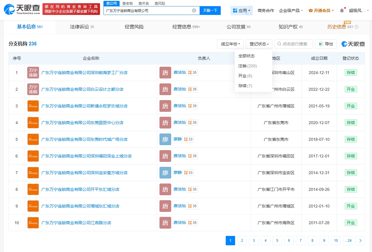万宁旗下数百家分店已注销