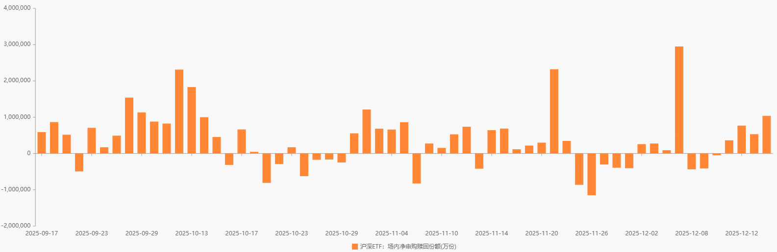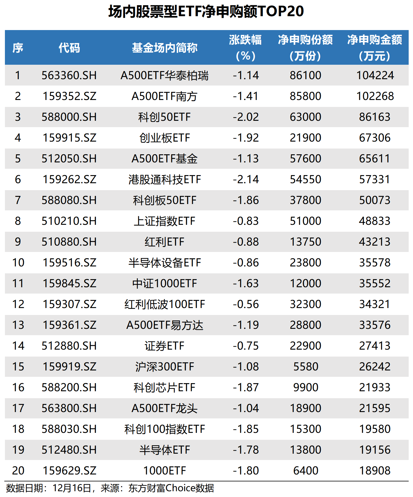 昨日(12月16日),东方财富Choice数据显示,场内股票型ETF净申购103.86亿份;其中,沪市股票型ETF净申购49.86亿份,深市股票型ETF净申购54.00亿份。以最新净值计,昨日市场净申购121.96亿元。