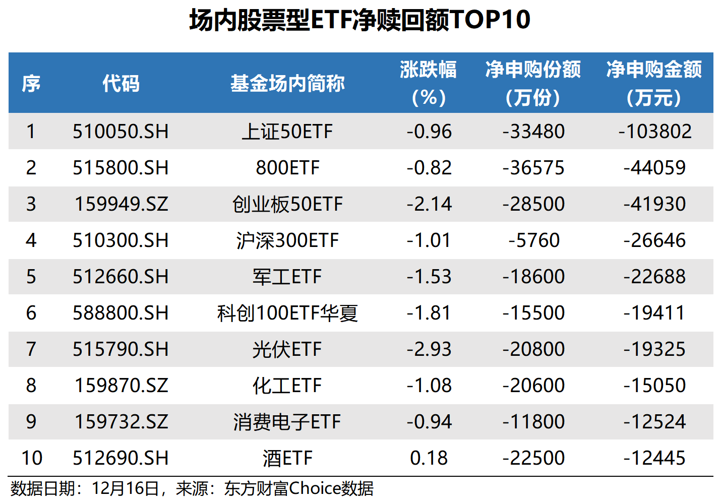 数据还显示,昨日净赎回金额最多的场内股票型ETF为上证50ETF,净赎回金额10.38亿元;800ETF紧随其后,净赎回金额4.41亿元。