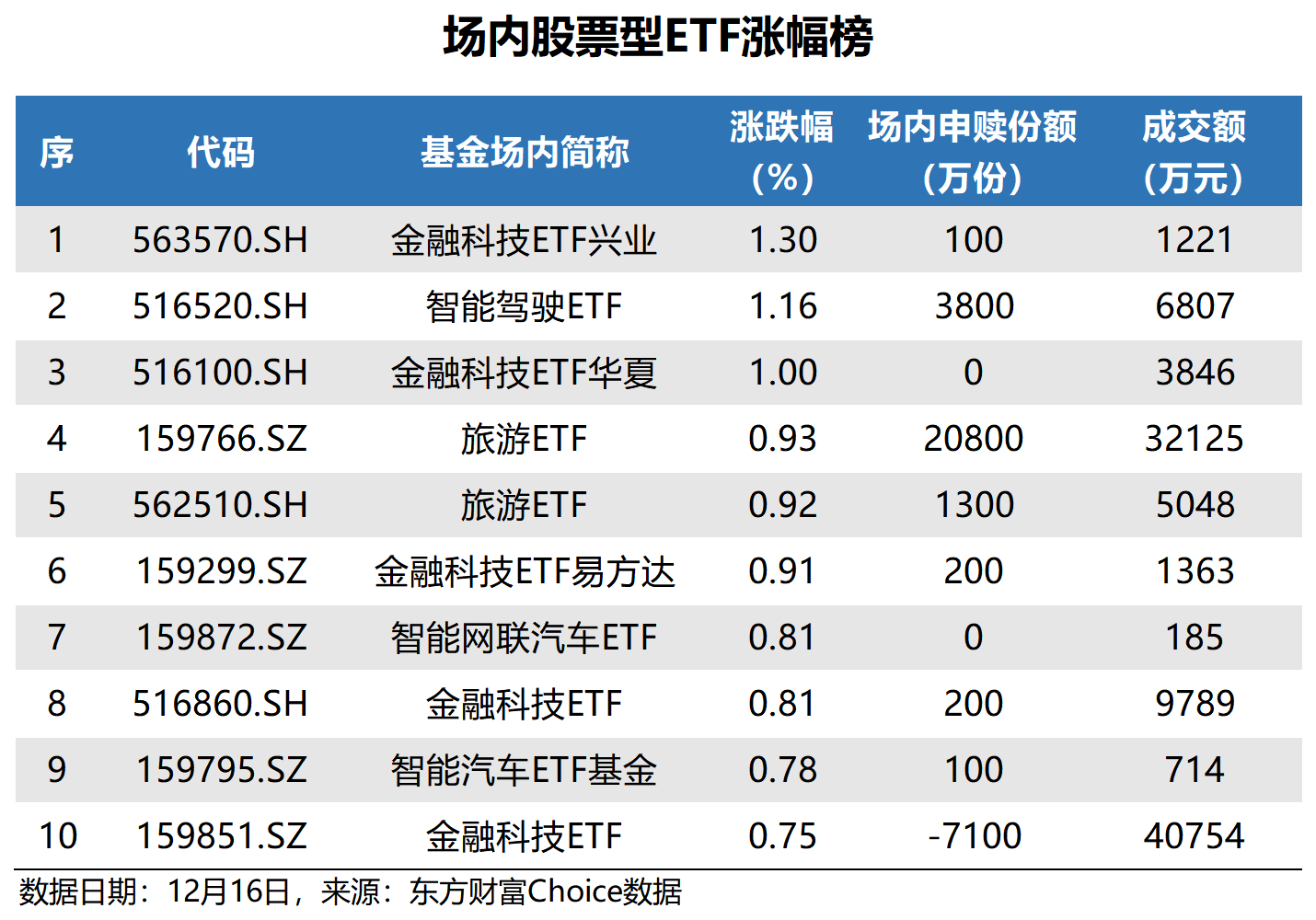 数据显示,昨日场内股票型ETF中,金融科技ETF兴业、智能驾驶ETF、金融科技ETF华夏涨幅居前。其中,金融科技ETF兴业涨幅最大,为1.30%。