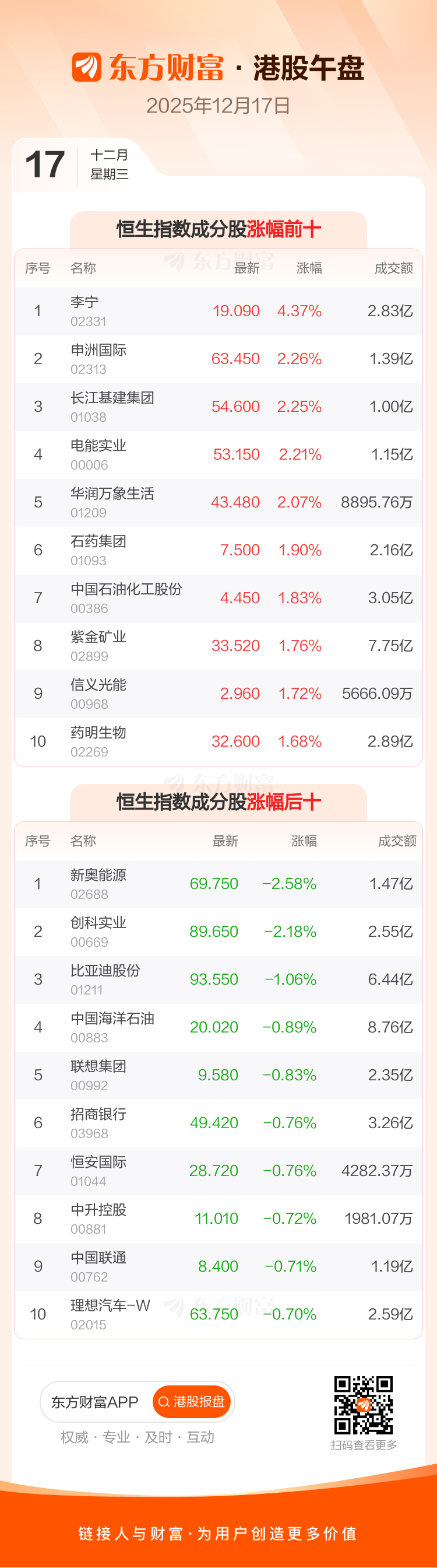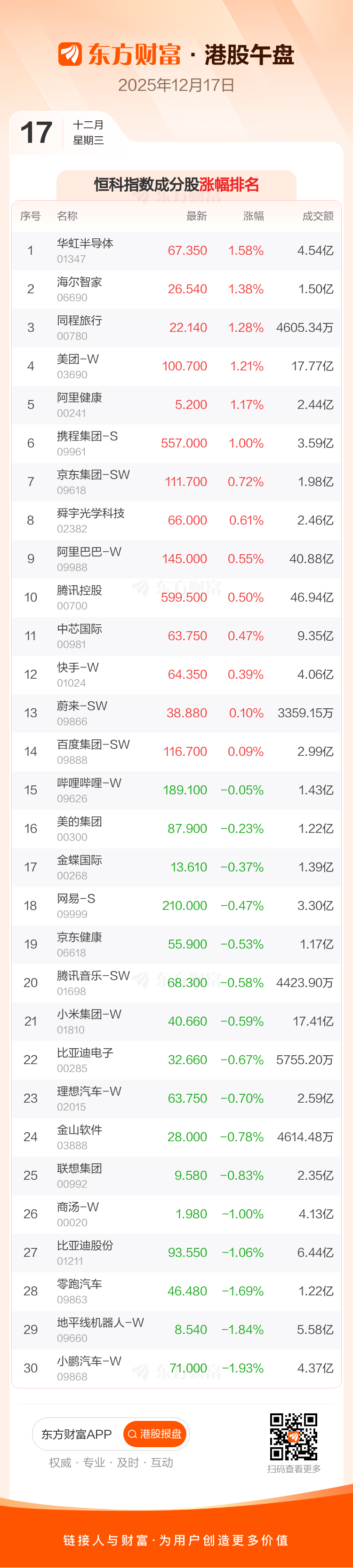 港股12月17日午盘走高,恒生指数收报25291.44点,涨56.03点,涨幅0.22%;恒生科技指数收报5403.74点,涨1.23点,涨幅0.02%。恒生指数成分股中李宁、申洲国际、长江基建集团涨幅居前,新奥能源、创科实业、比亚迪股份跌幅靠前。恒生科技指数成分股中华虹半导体、海尔智家、同程旅行涨幅居前,小鹏汽车-W、地平线机器人-W、零跑汽车跌幅靠前。