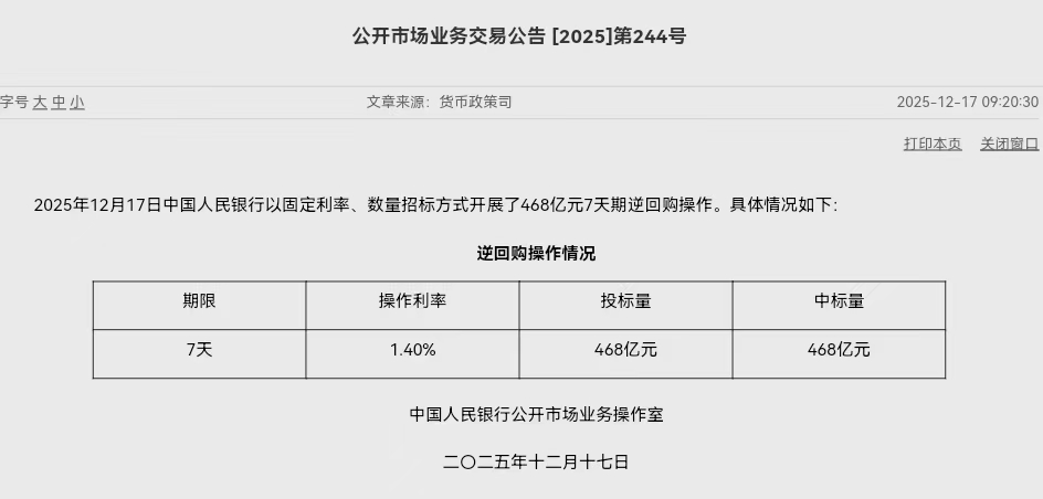 央行网站12月17日消息,央行今日开展468亿元7天期逆回购操作,操作利率为1.40%,与此前持平。因今日有1898亿元7天期逆回购到期,当日实现净回笼1430亿元。