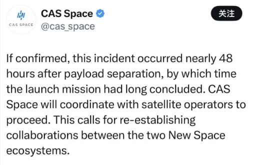 随后,中科宇航再次发文称,如果证实“近距离接近事件”发生在有效载荷分离后约48小时,那当时发射任务早已结束。中科宇航将与卫星运营商协调推进,这需要在两个新空间生态系统之间重新建立合作关系。