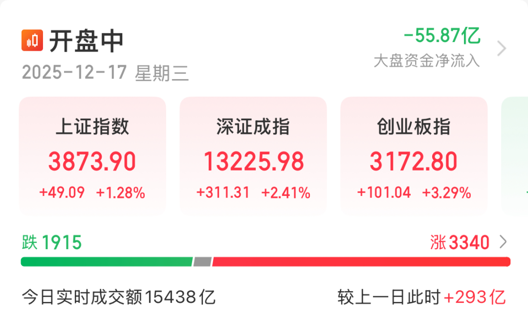 午后,A股三大指数走强。截至发稿,创业板指拉升涨逾3%,沪指涨1.28%,深证成指涨2.41%。大金融、算力硬件、有色金属、锂电等方向涨幅居前,沪深北三市上涨个股超3300只,成交15438亿元,较上一日此时放量293亿元。