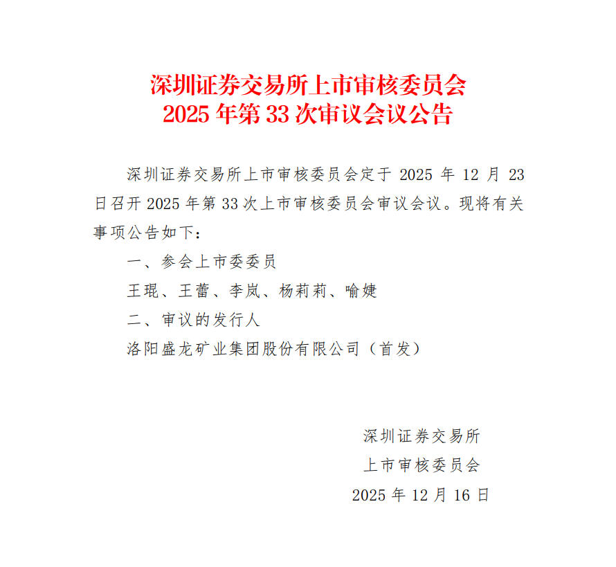 12月16日,深圳证券交易所公告显示,深圳证券交易所上市审核委员会定于2025年12月23日召开2025年第33次上市审核委员会审议会议,审议洛阳盛龙矿业集团股份有限公司(首发)(以下简称“盛龙股份”)。