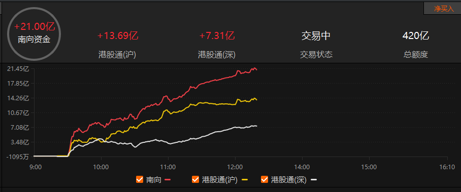 12月17日13时20分,南向资金净买入达到21亿港元。