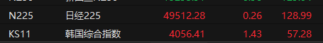 12月17日,日韩股市收盘齐涨。日经225指数涨0.26%,报49512.28点;韩国综合指数涨1.43%,报4056.41点。