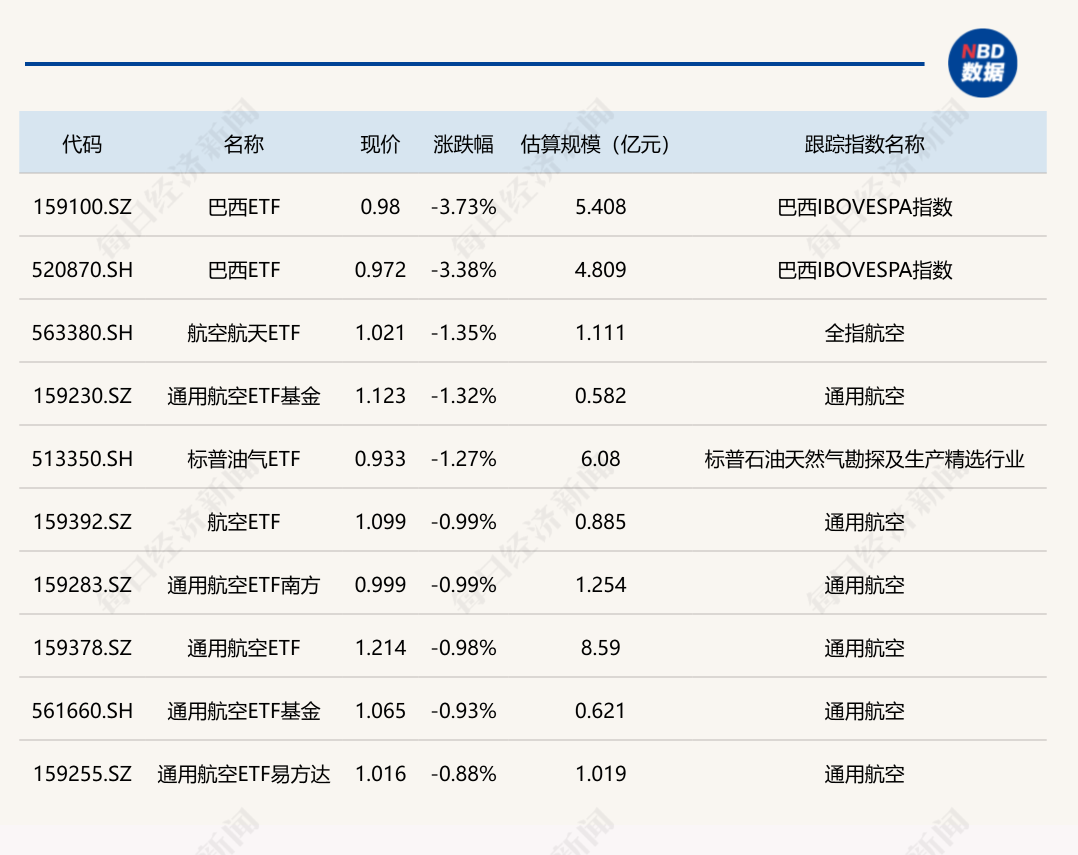 下跌方面,巴西ETF跌超3%,航天相关ETF跌约1%。