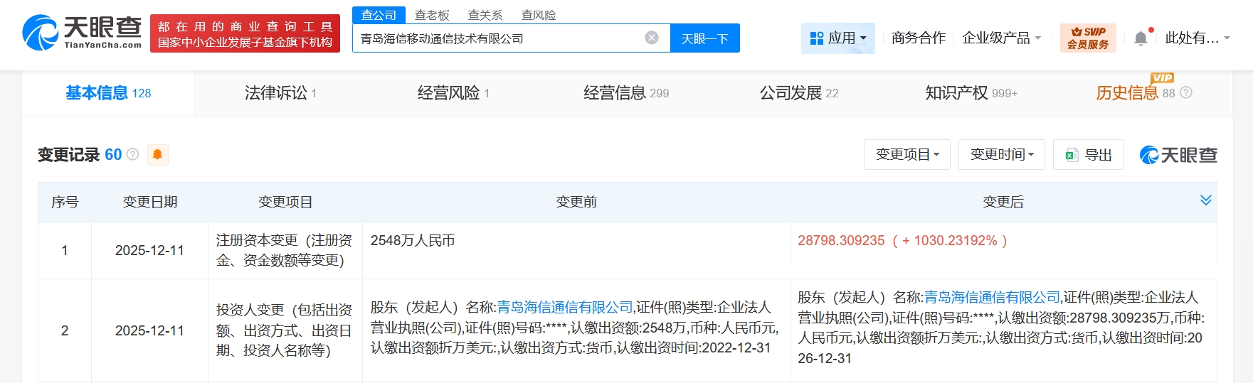 南方财经12月17日电,天眼查App显示,近日,青岛海信移动通信技术有限公司发生工商变更,注册资本由2548万人民币增至约2.9亿人民币,增幅约1030%。该公司成立于2005年8月,法定代表人为钟明林,经营范围含移动通信设备制造、移动通信设备销售、安防设备销售、网络与信息安全软件开发、物联网技术研发、5G通信技术服务、卫星技术综合应用系统集成、导航终端制造等,由青岛海信通信有限公司全资持股。