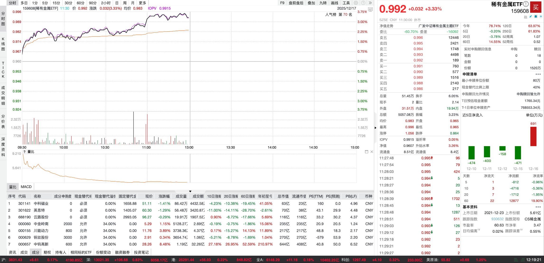 截至12月17日午间收盘,A股市场稀有金属板块表现抢眼,多只稀有金属ETF涨幅居前。
