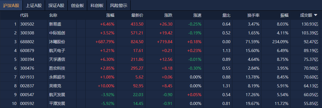 个股方面,新易盛成交额超130亿元居首,中际旭创、沐曦股份、航天电子成交额靠前。