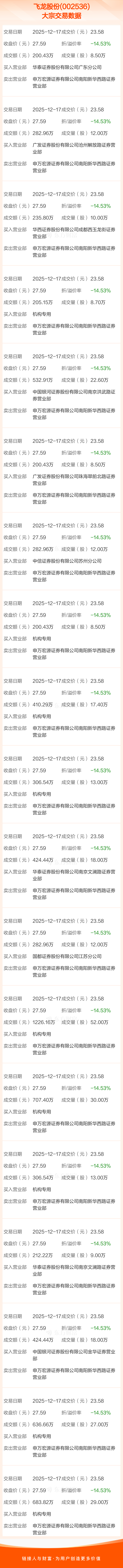 2025年12月17日,飞龙股份发生19笔大宗交易,共成交329.20万股,成交金额7762.54万元,占其流通市值比例为0.52%