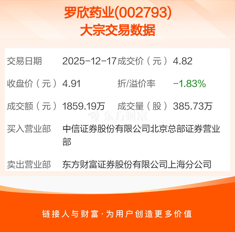 2025年12月17日,罗欣药业发生1笔大宗交易,共成交385.73万股,成交金额1859.19万元,占其流通市值比例为0.35%