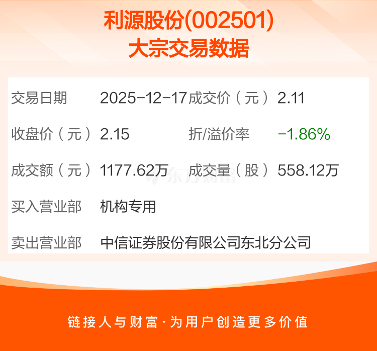 2025年12月17日,利源股份发生1笔大宗交易,共成交558.12万股,成交金额1177.62万元,占其流通市值比例为0.15%