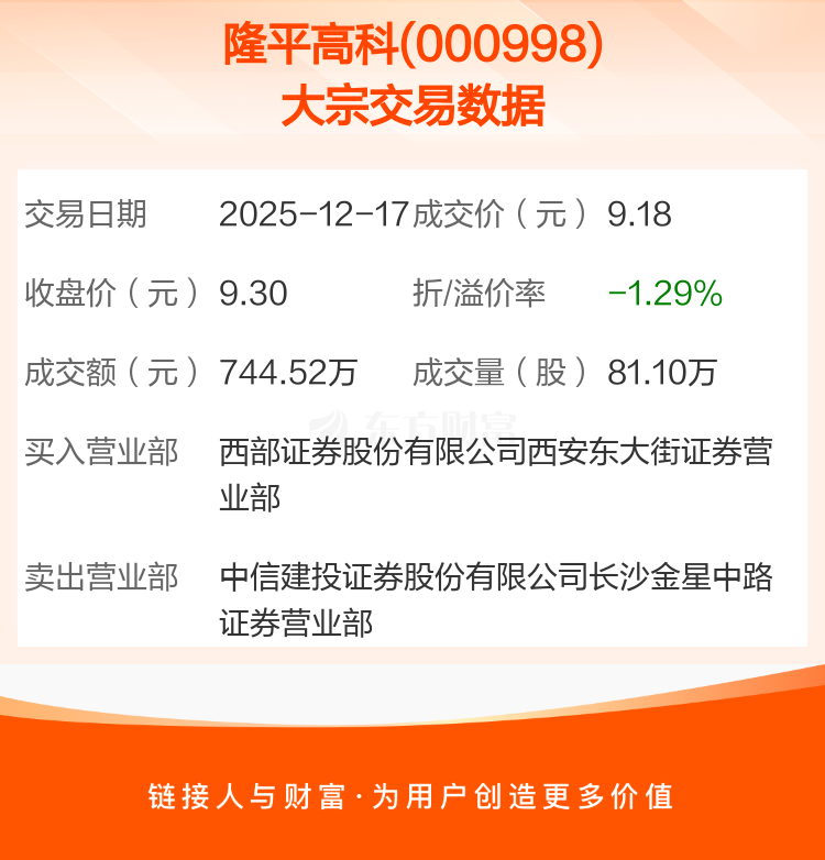 2025年12月17日,隆平高科发生1笔大宗交易,共成交81.10万股,成交金额744.52万元,占其流通市值比例为0.06%
