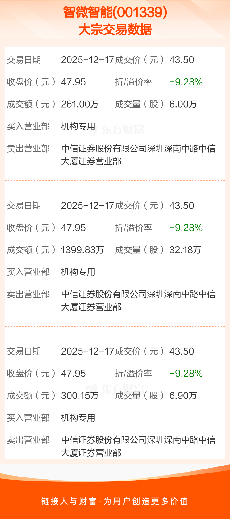 2025年12月17日,智微智能发生3笔大宗交易,共成交45.08万股,成交金额1960.98万元,占其流通市值比例为0.34%