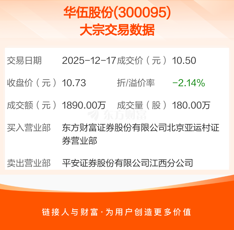 大宗交易:华伍股份成交1890.00万元,折价2.14%(12-17)