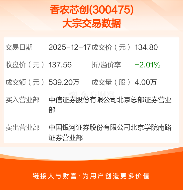 2025年12月17日,香农芯创发生1笔大宗交易,共成交4.00万股,成交金额539.20万元