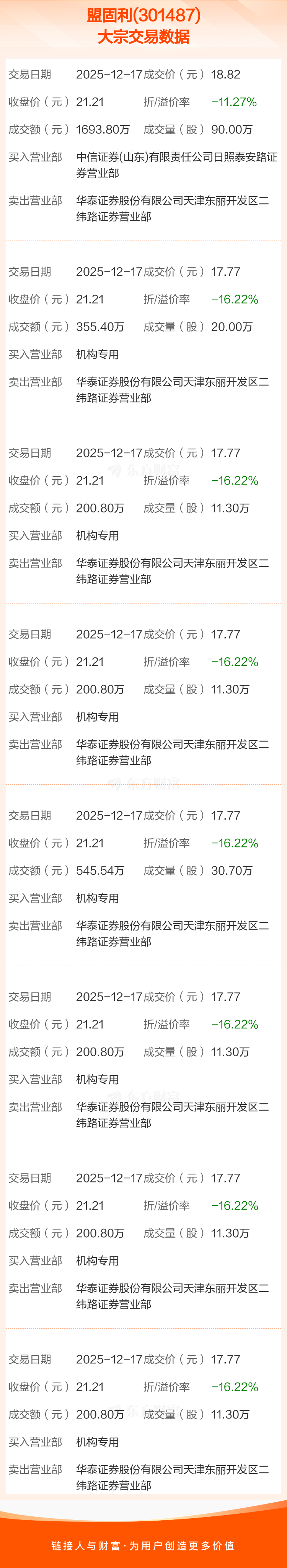 2025年12月17日,盟固利发生8笔大宗交易,共成交197.20万股,成交金额3598.74万元,占其流通市值比例为0.62%。
