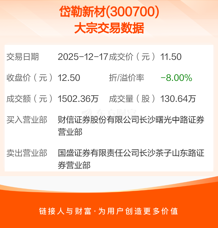 2025年12月17日,岱勒新材发生1笔大宗交易,共成交130.64万股,成交金额1502.36万元,占其流通市值比例为0.44%。