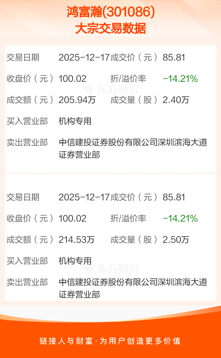 大宗交易:鸿富瀚成交420.47万元,折价14.21%(12-17)