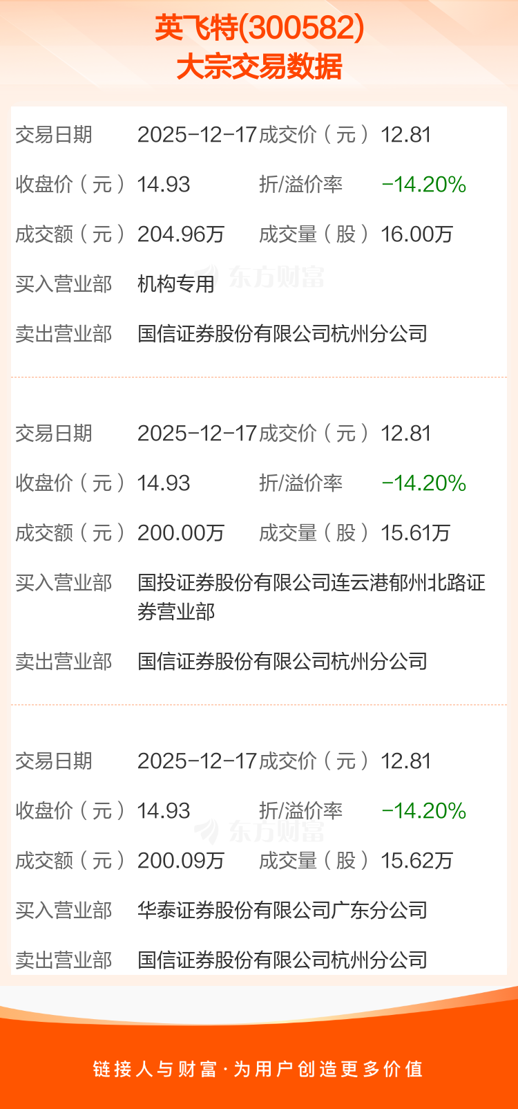 2025年12月17日,英飞特发生3笔大宗交易,共成交47.23万股,成交金额605.05万元,占其流通市值比例为0.18%