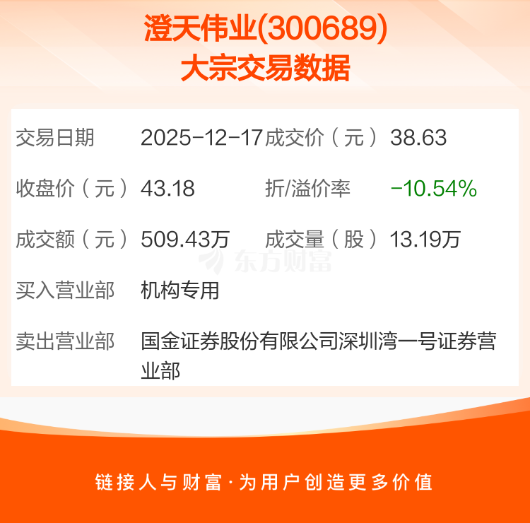 2025年12月17日,澄天伟业发生1笔大宗交易,共成交13.19万股,成交金额509.43万元,占其流通市值比例为0.12%