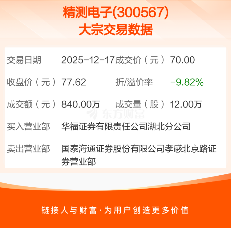 大宗交易:精测电子成交840.00万元,折价9.82%(12-17)