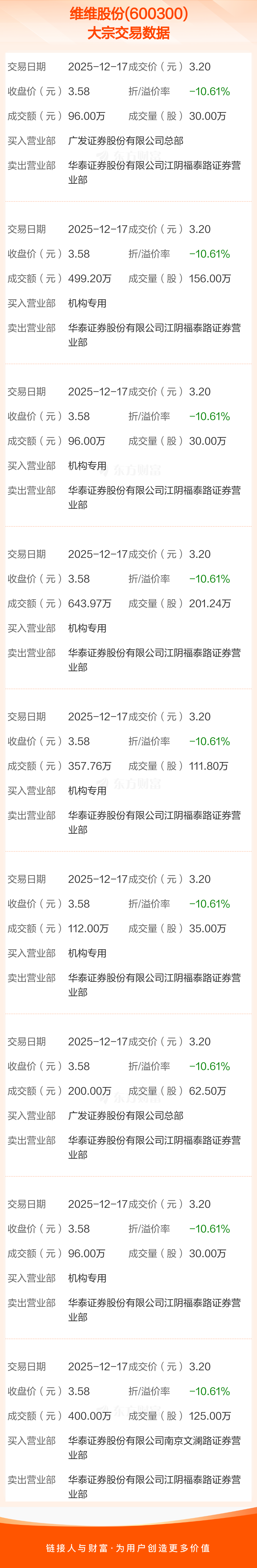 大宗交易:维维股份成交2500.93万元,折价10.61%(12-17)