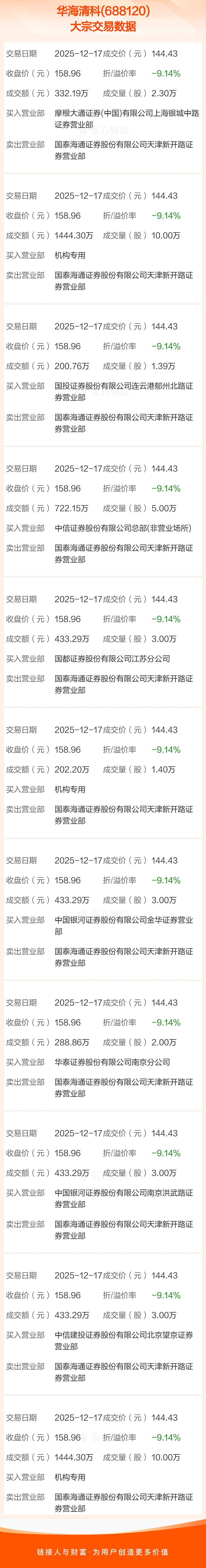 2025年12月17日,华海清科发生11笔大宗交易,共成交44.09万股,成交金额6367.92万元,占其流通市值比例为0.11%