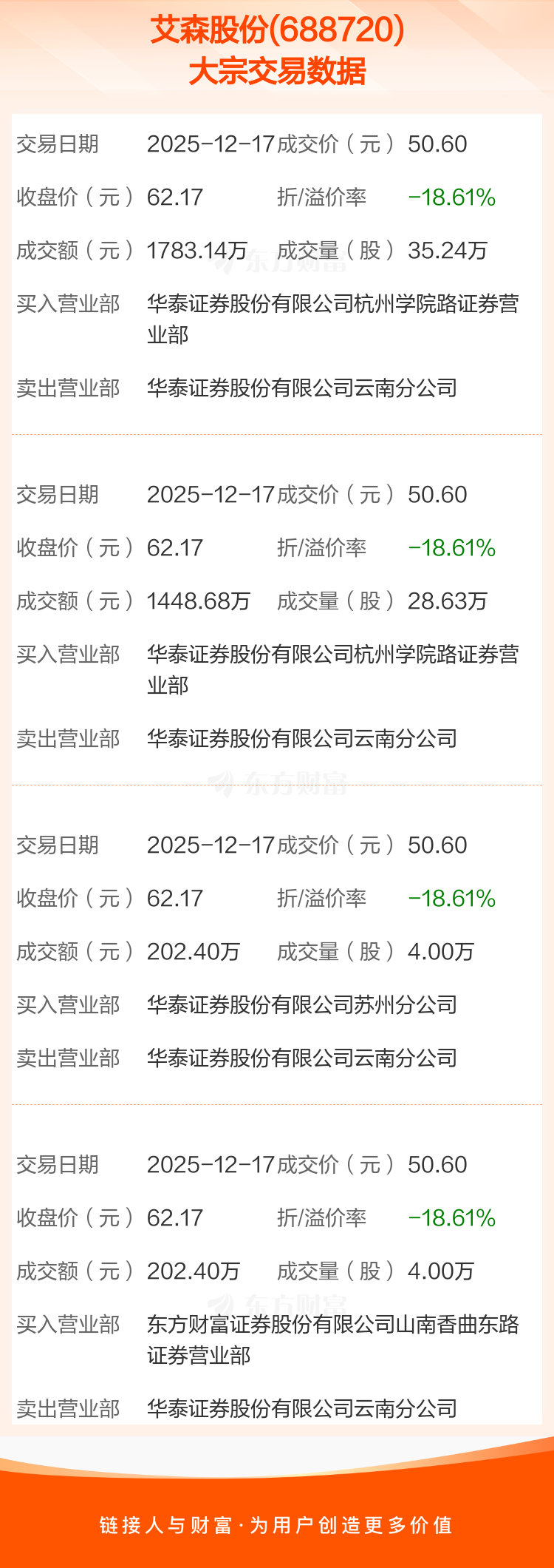 4笔大宗交易成交均价50.60元,较该股当日收盘价62.17元折价18.61%。
