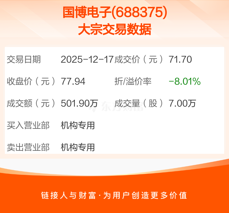 2025年12月17日,国博电子发生1笔大宗交易,共成交7.00万股,成交金额501.90万元,占其流通市值比例为0.01%。