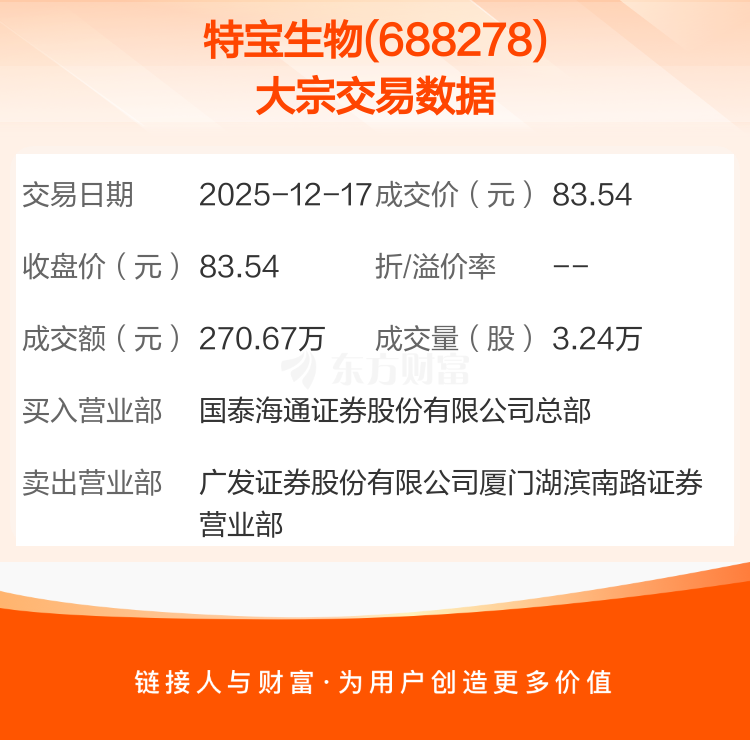 2025年12月17日,特宝生物发生1笔大宗交易,共成交3.24万股,成交金额270.67万元。