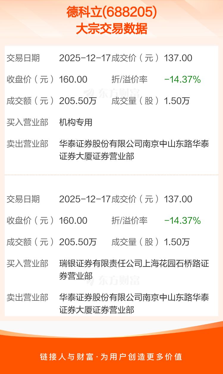 2025年12月17日,德科立发生2笔大宗交易,共成交3.00万股,成交金额411.00万元,占其流通市值比例为0.02%。