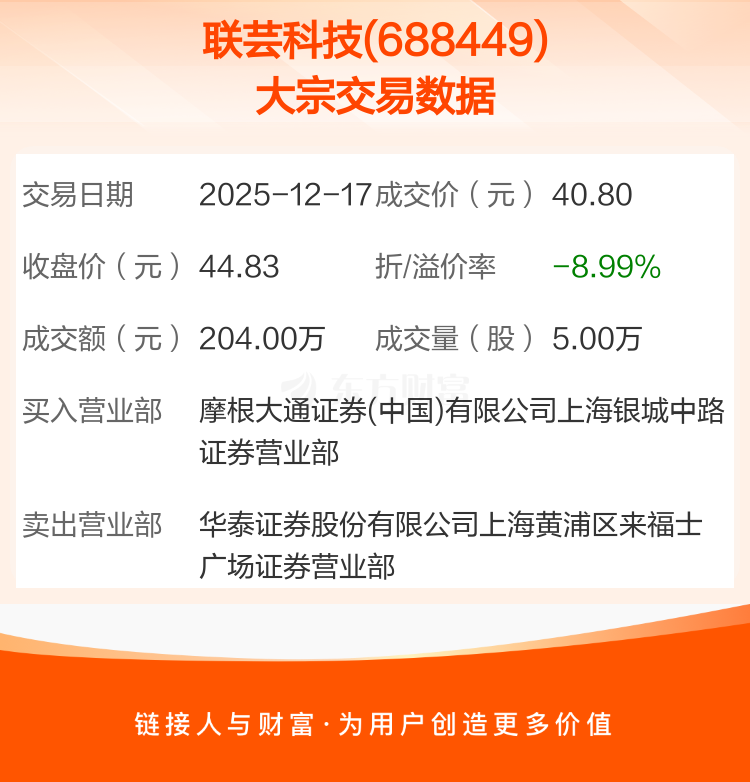 2025年12月17日,联芸科技发生1笔大宗交易,共成交5.00万股,成交金额204.00万元,占其流通市值比例为0.02%