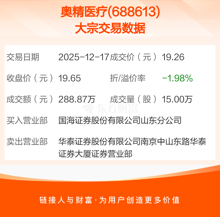 2025年12月17日,奥精医疗发生1笔大宗交易,共成交15.00万股,成交金额288.87万元,占其流通市值比例为0.11%