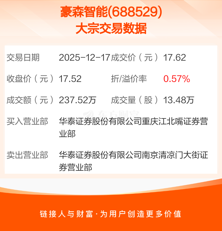 2025年12月17日,豪森智能发生1笔大宗交易,共成交13.48万股,成交金额237.52万元,占其流通市值比例为0.08%