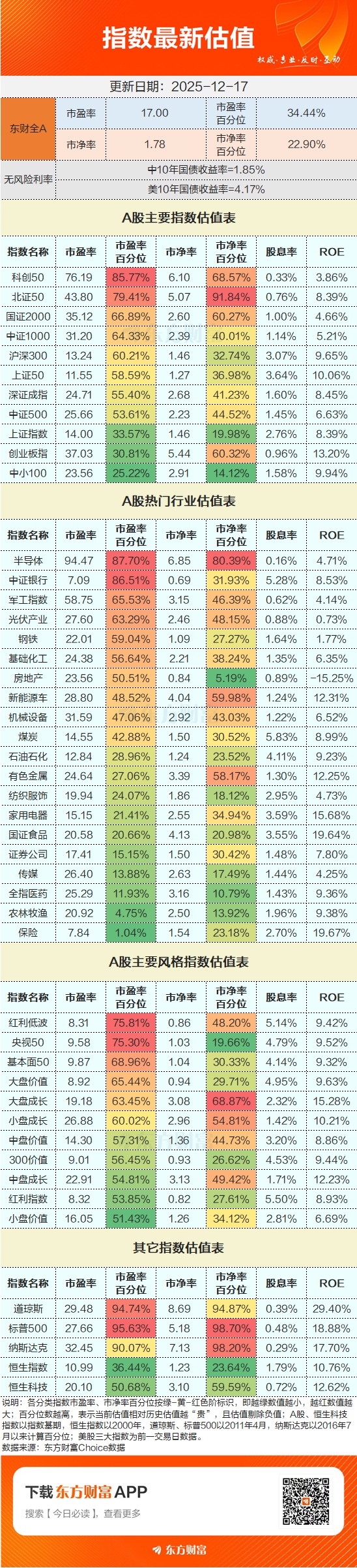截至12月17日收盘,东方财富Choice数据显示,东财全A市盈率为17倍,市盈率百分位为34.44%;市净率为1.78倍,市净率百分位为22.9%。