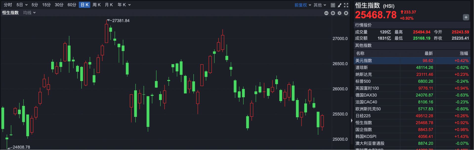 截至收盘,恒生指数报收于25468.78点,上涨233.37点,涨幅0.92%。