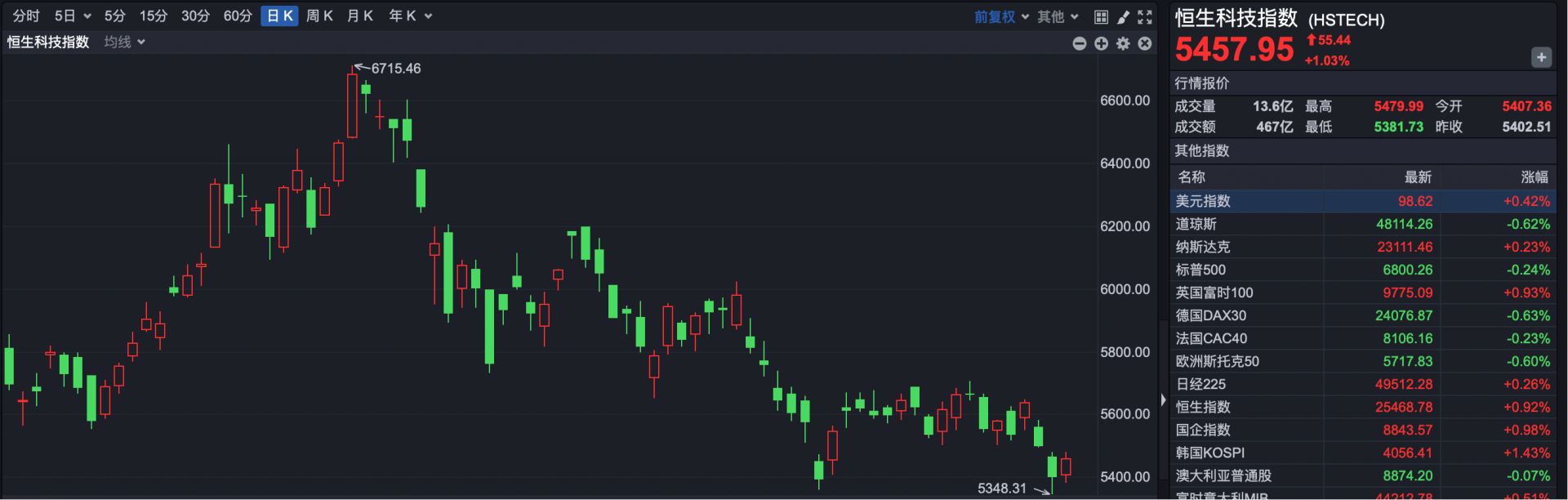 恒生科技指数收报5457.95点,上涨55.44点,涨幅1.03%。