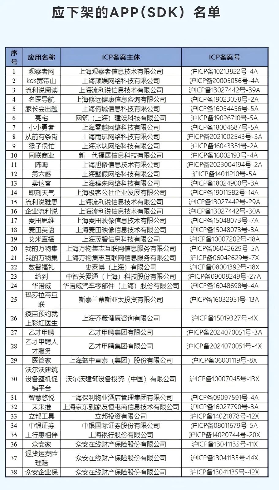 12月17日,上海市通信管理局发布通报,宣布对玛莎拉蒂互联等38款存在侵害用户权益行为的APP(SDK)作下架处理。