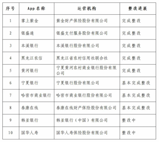 上述完成整改的App,其对应的运营机构分别为:紫金财产保险股份有限公司、银盛支付服务股份有限公司、本溪银行股份有限公司、黑龙江省农村信用社联合社和宁夏黄河农村商业银行股份有限公司。