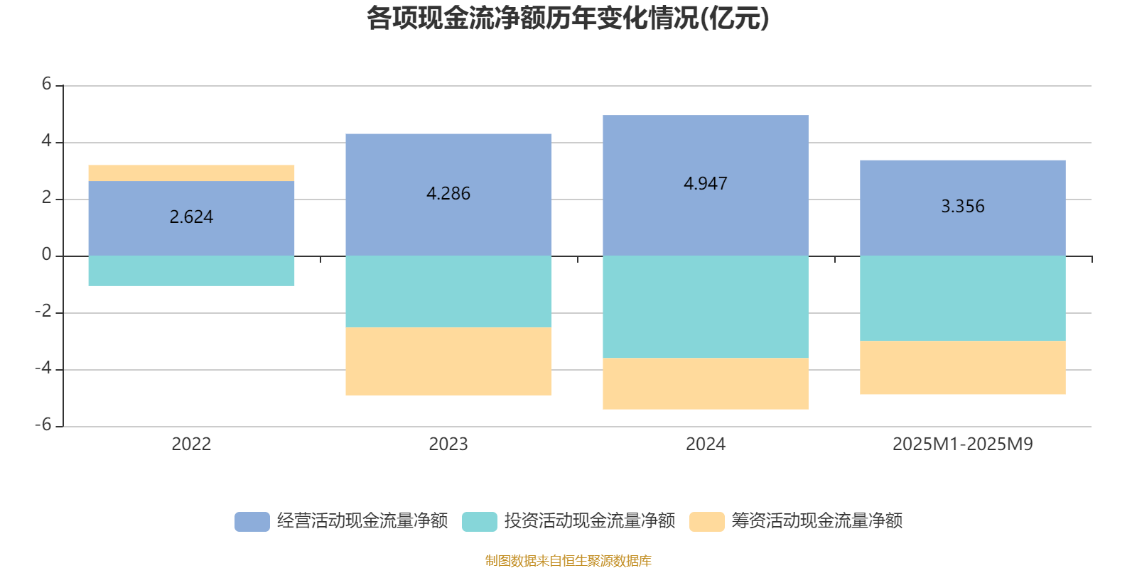 2025年1月至9月,公司经营活动现金流净额为3.36亿元,同比下降10.63%;筹资活动现金流净额-1.88亿元,同比减少8089.2万元;投资活动现金流净额-3.01亿元,上年同期为-2.7亿元。