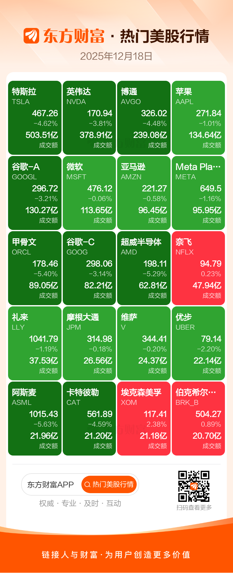 特斯拉跌4.62%,英伟达跌3.81%,博通跌4.48%,苹果跌1.01%,谷歌-A跌3.21%,微软跌0.06%,亚马逊跌0.58%,Meta Platforms Inc-A跌1.16%,甲骨文跌5.40%,谷歌-C跌3.14%。