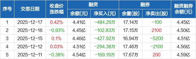 融资方面,当日融资买入506.75万元,融资偿还991.04万元,融资净偿还484.29万元,连续5日净偿还累计1478.61万元。融券方面,融券卖出2400股,融券偿还2500股,融券余量17.14万股,融券余额493.94万元。融资融券余额合计4.45亿元。