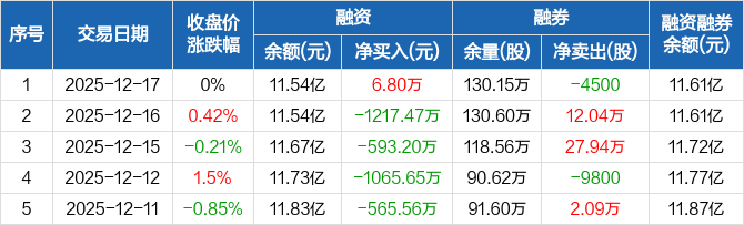 融资方面,当日融资买入2725.42万元,融资偿还2718.61万元,融资净买入6.8万元。融券方面,融券卖出20.84万股,融券偿还21.29万股,融券余量130.15万股,融券余额618.21万元。融资融券余额合计11.61亿元。
