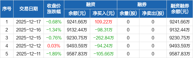 融资方面,当日融资买入276.53万元,融资偿还167.31万元,融资净买入109.22万元。融券方面,融券卖出0股,融券偿还0股,融券余量0股,融券余额0元。融资融券余额合计9241.66万元。