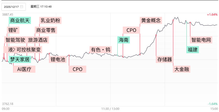 财联社12月18日电,上个交易日市场集体反弹,沪指涨超1%,创业板指涨超3%。全市场超3600只个股上涨。沪深两市成交额1.81万亿,较前日放量870亿。1)受益北美和国产算力全面加速导入液冷,早盘相关概念股继续强势表现,英维克再创历史新高,飞龙股份、大元泵业、宏盛股份等多股涨停。而在整个算力硬件近期行情中,资金依旧围绕高速光模块以及M9上游的光器件、电子布、铜箔、钻针等细分,环旭电子、中钨高新双双创历史新高,“易中天”光模块三巨头均收涨超6%。2)据报道,继宁德时代枧下窝矿被关停后,宜春市自然资源局发布公示,拟对27宗采矿许可证予以注销。江特电机旗下宜丰县狮子岭矿区含锂瓷石矿赫然在列。受此提振,广期所碳酸锂主力合约日内一度逼近11万元/吨,最高涨幅近9%,刺激锂矿概念集体爆发,大中矿业、盛新锂能、金圆股份封涨停,天华新能涨近15%。此外磷酸铁锂、电解液等中游材料分支也迎来强修复,天际股份录得涨停。3)中央财办有关负责同志表示,扩大内需是明年排在首位的重点任务,明年要把握消费的结构性变化,从供需两侧发力提振消费。尽管安记食品、皇氏集团等前期领涨的高位股表现承压,但零售股百大集团、利群股份仍双双实现连板晋级。此外受益元旦小长假入住热门城市酒店订单量同比增长3倍以上的消息刺激,曲江文旅、三峡旅游两股盘中一度触及涨停。4)11月20日,中金公司吸收合并东兴证券和信达证券一事披露,随着三家公司复牌日期临近,AH两市券商股双双爆发,华泰证券一度拉升逼近涨停,广发证券一度涨超5%。