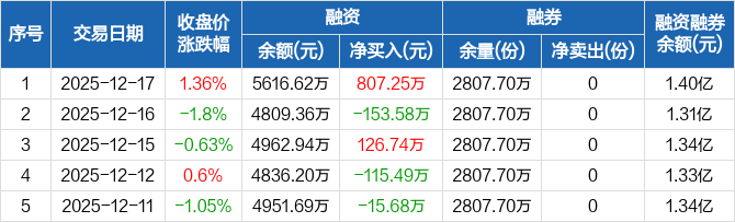 融资方面,当日融资买入1075.04万元,融资偿还267.78万元,融资净买入807.25万元。融券方面,融券卖出0份,融券偿还0份,融券余量2807.7万份,融券余额8397.83万元。融资融券余额合计1.4亿元。