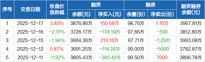 融资方面,当日融资买入983.35万元,融资偿还832.66万元,融资净买入150.68万元。融券方面,融券卖出2.3万份,融券偿还1.2万份,融券余量98.76万份,融券余额90.96万元。融资融券余额合计3967.81万元。